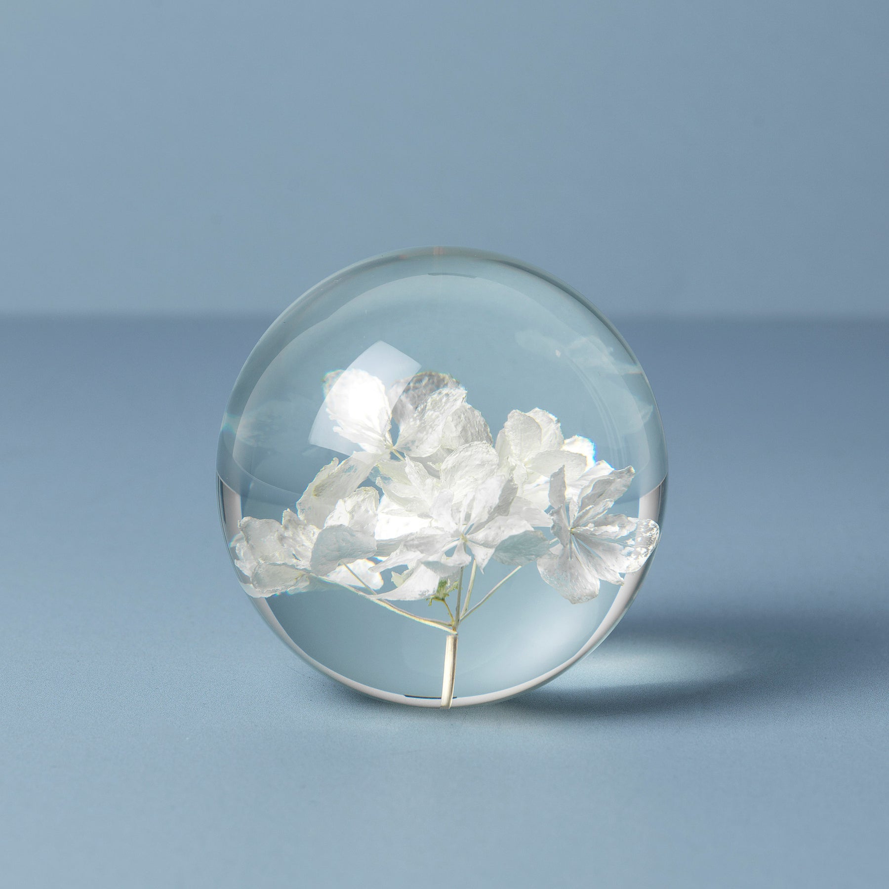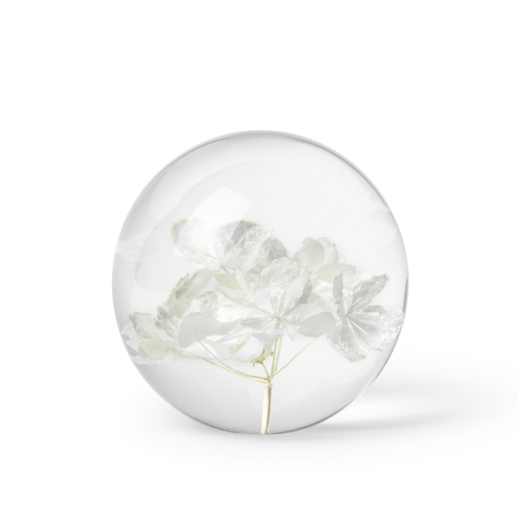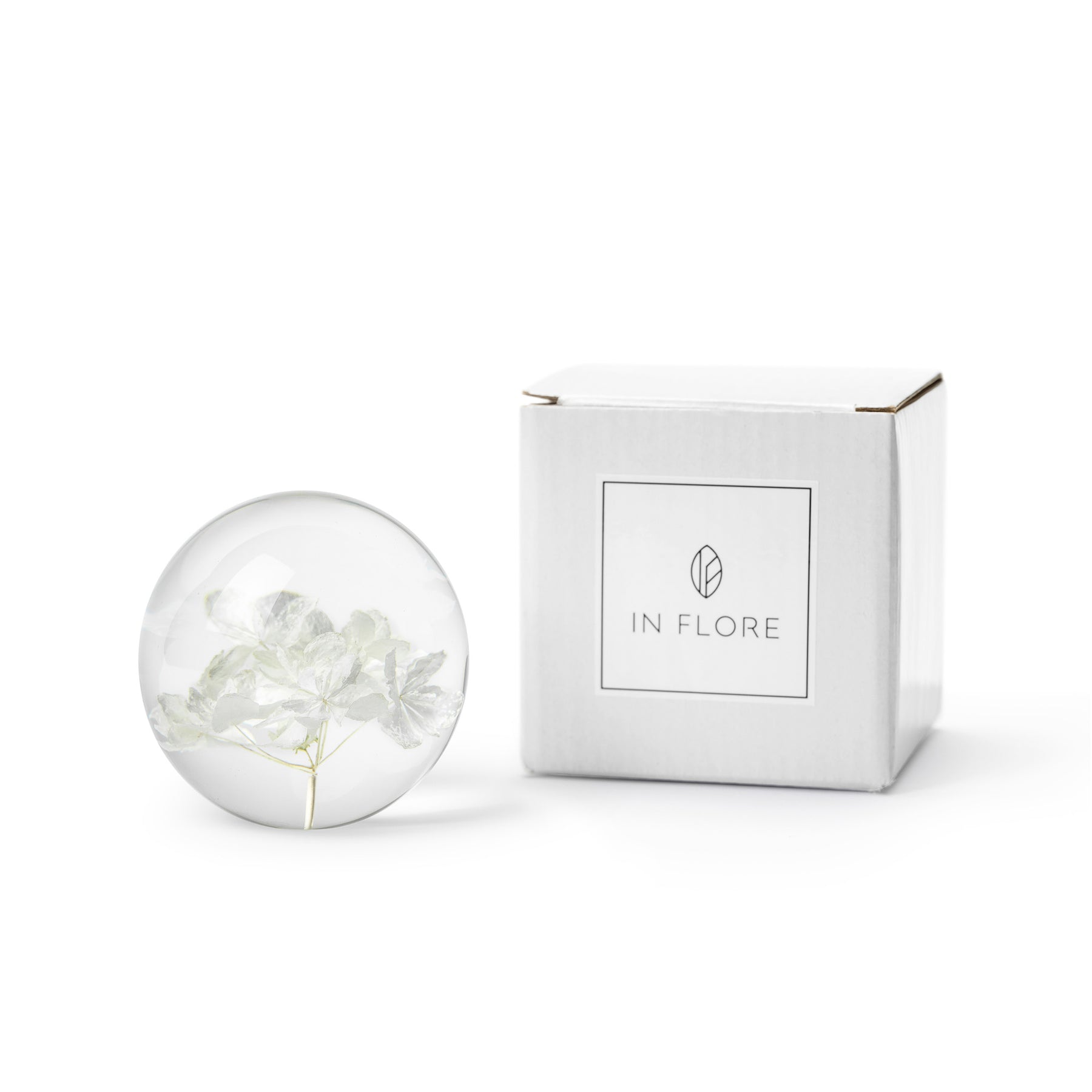Beautiful In Flore Hydrangea, Hortensia paperweight featuring a white flower. The paperweight is made from crystal resin with a real hydrangea, hortensia flower moulded inside.