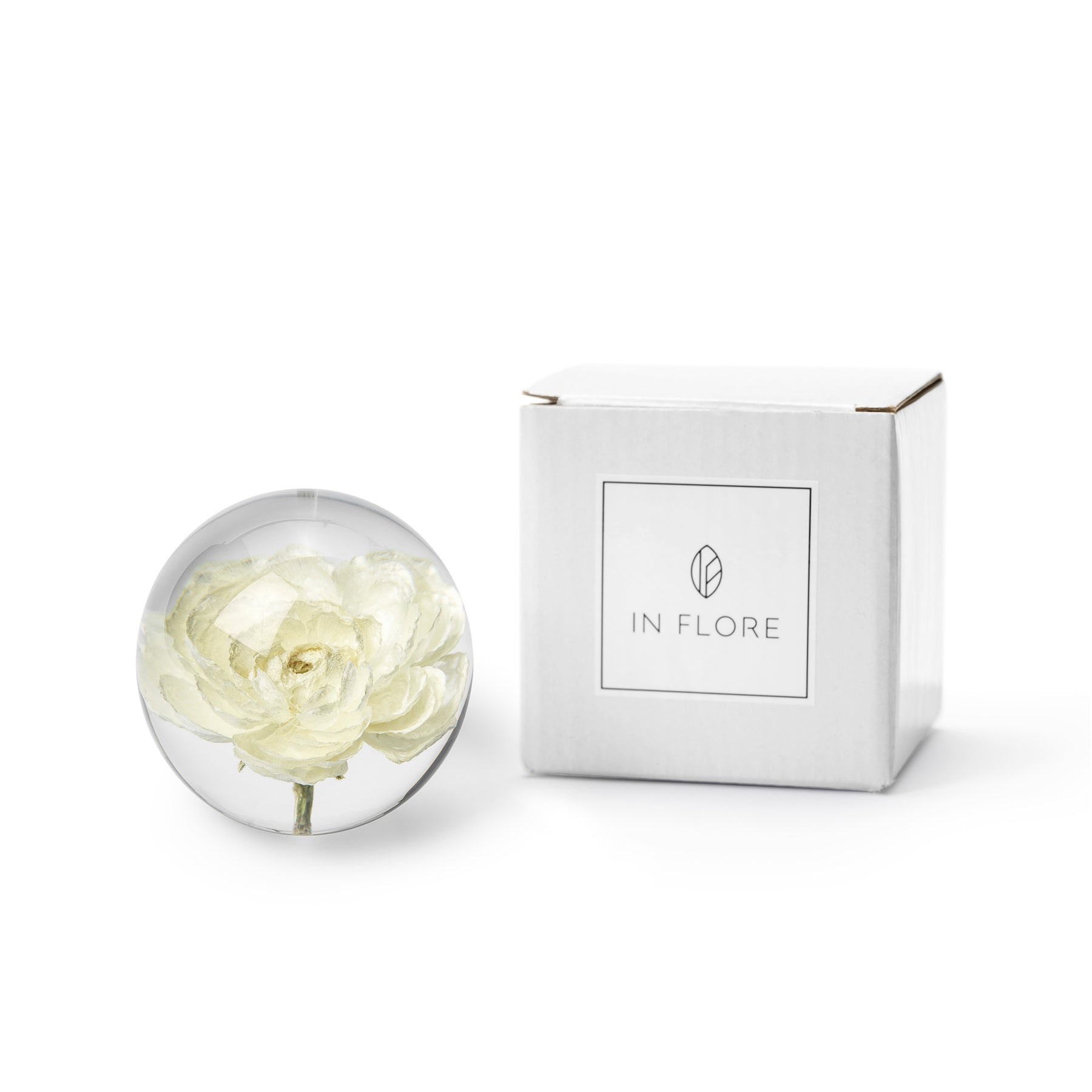 Beautiful In Flore Peony Rose "Ranunculus" paperweight featuring a white peony rose ranunculus flower. The paperweight is made from crystal resin with a real ranunculus flower moulded inside.